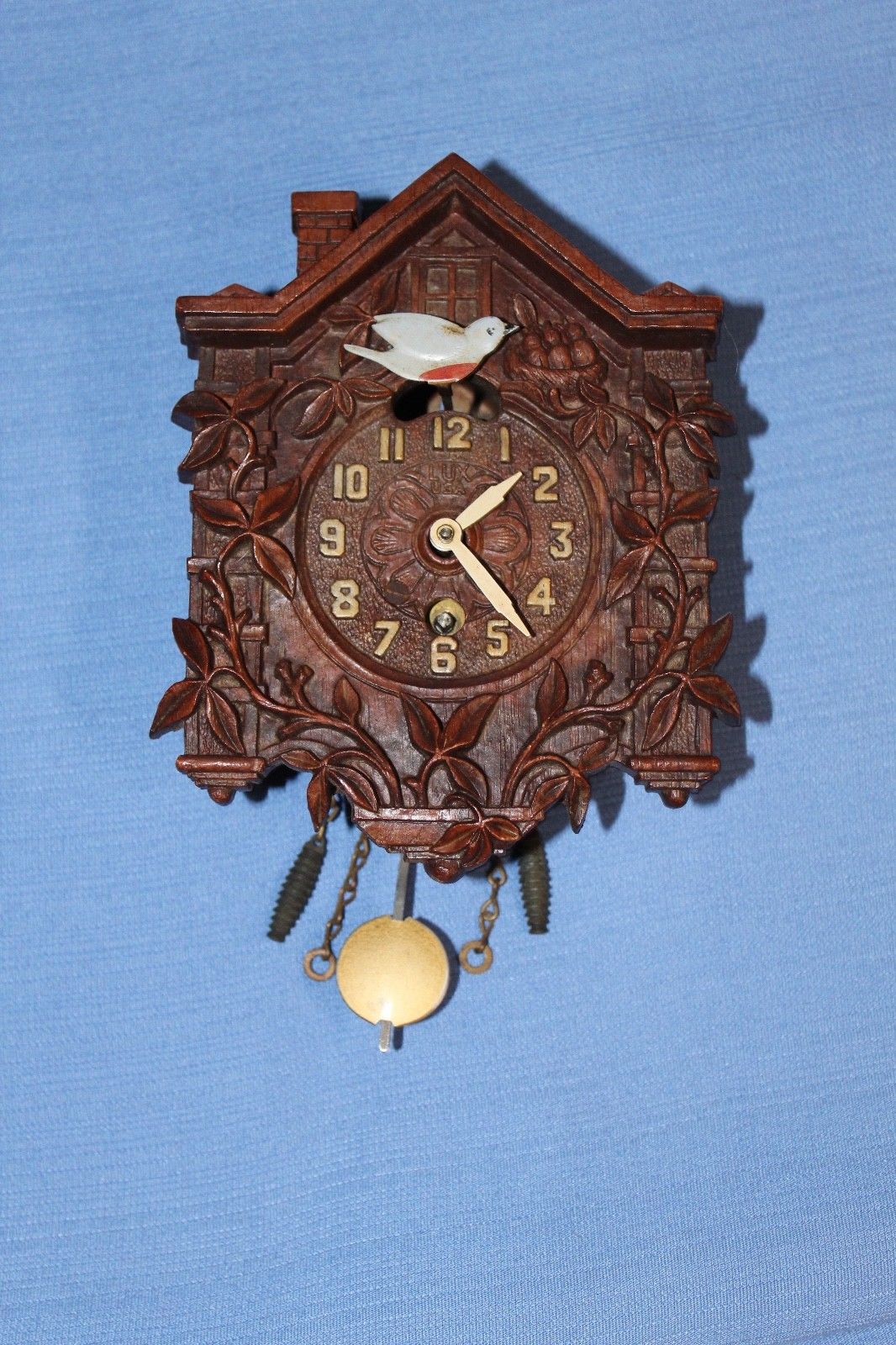 Title (ebay affiliate link): LUX ANTIQUE MINIATURE FLYING BLUEBIRD CLOCK 100% ORIGINAL BEAUTIFUL RUNS GREAT!