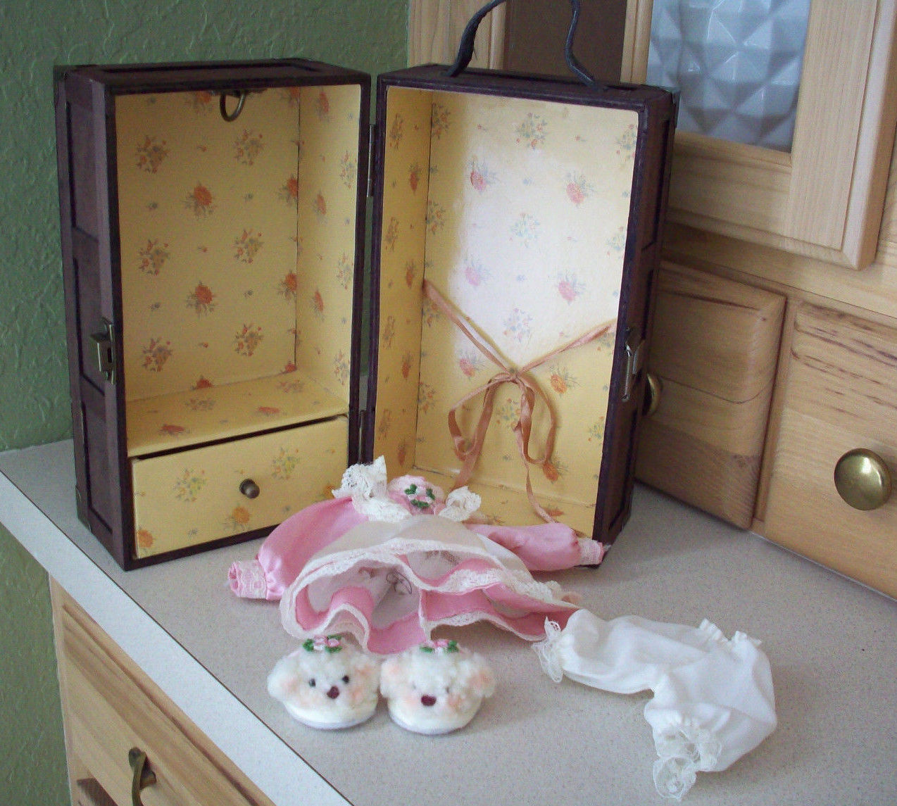 Title (ebay affiliate link): Vintage Wooden Doll Trunk Case Leather Handle w/ Dress, Slippers, Pantaloons