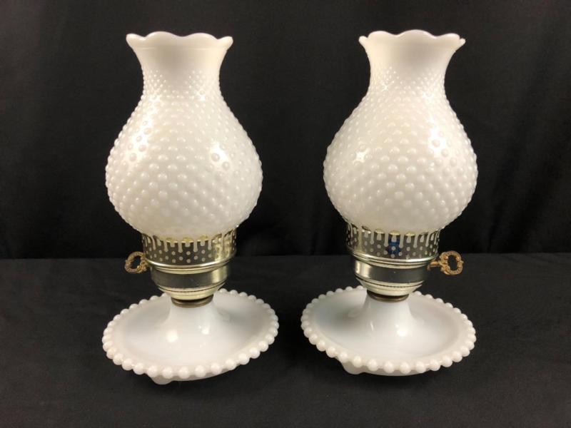 Pair Vintage Milk Glass Hobnail Hurricane Dresser Boudoir Lamps