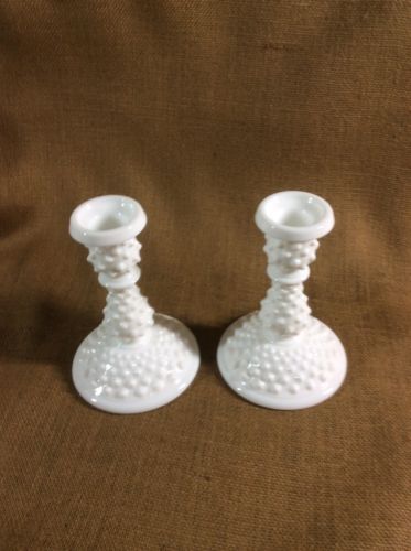 Title (ebay affiliate link): Fenton Hobnail Rounded 2 White Milk Glass Candlestick Holders 6" Tall