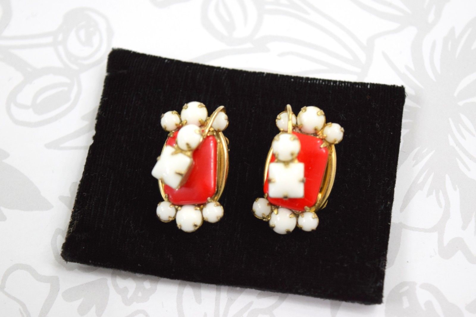 Title (ebay affiliate link): Vintage Gold Tone Milk Glass Red Coral Imitation Earrings Clip On 40s 1.25" tall