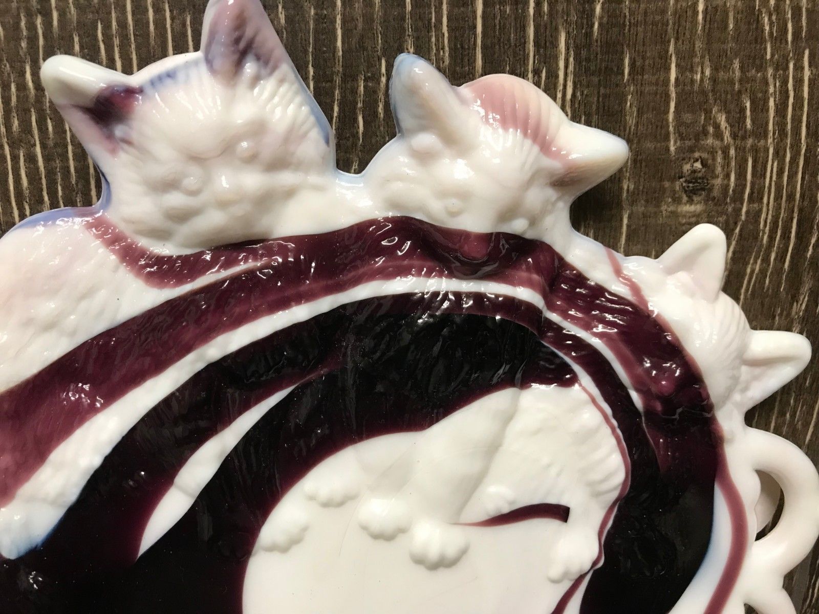 Westmoreland, White Milk Glass, Purple Blue Mauve, Slag Swirl Cat Plate Dish