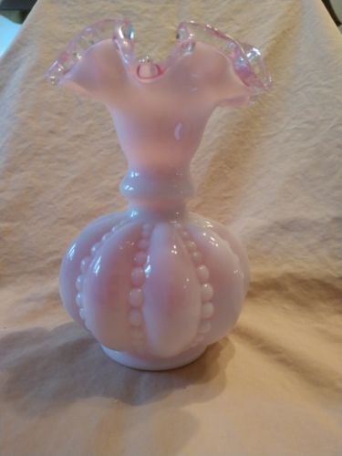 Title (ebay affiliate link): Vintage White Milk Glass FENTON Pink Lined (Melon) Silver Crest Ruffled Vase