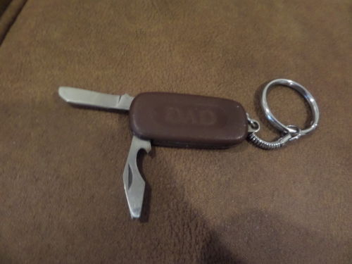 Title (ebay affiliate link): Vintage jack knife key chain covered in brown leather and "DAD" inscribed