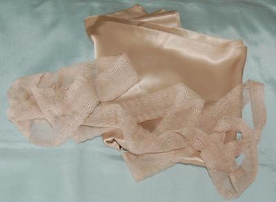 Title (ebay affiliate link): Antique Satin Fabric Remnant Lace Trim Ecru Restoration Dolls c1930s