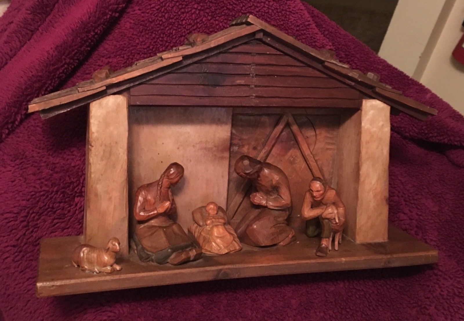Nice Old Black Forest Carved Wood Figures in Manger Nativity Statue