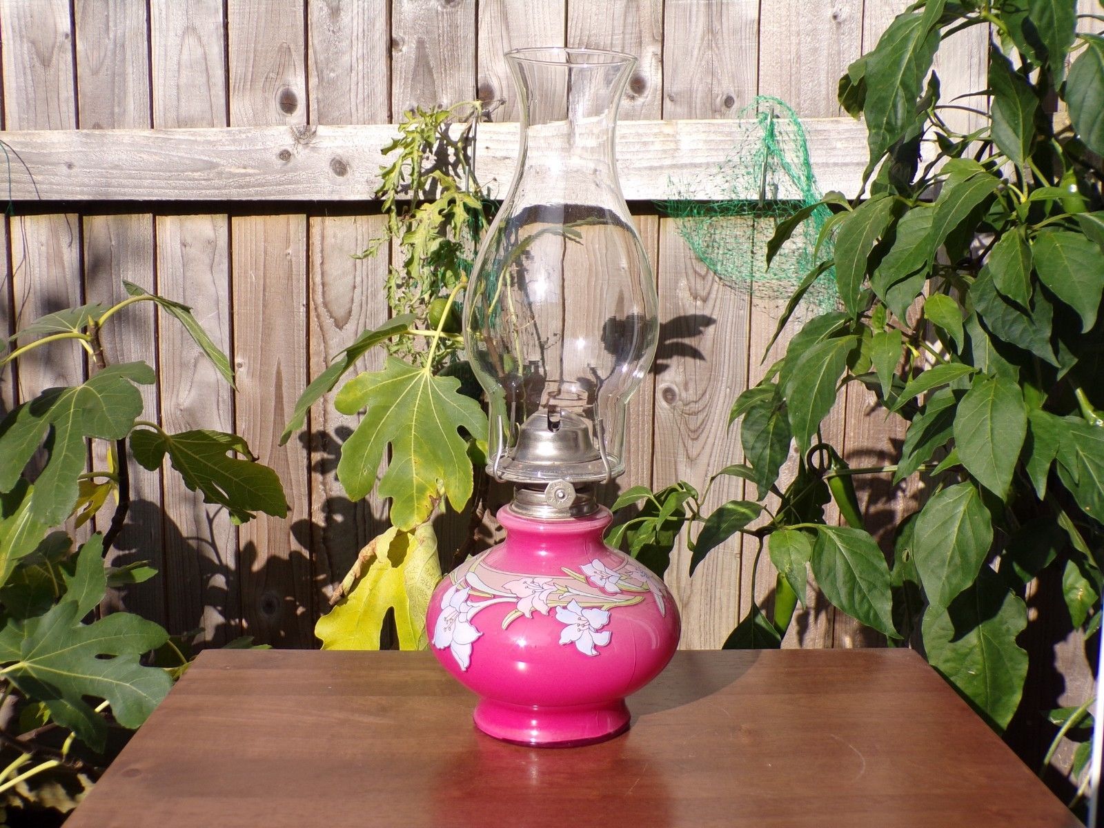 Title (ebay affiliate link): Vintage pink Glass Oil Lamp Kaadan ltd with flower decoration working order