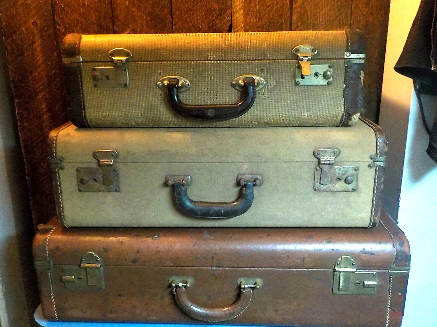 Title (ebay affiliate link): Antique Old Suitcases Flat Top Hardcase Wood Leather Bakelite Browns 3 sizes