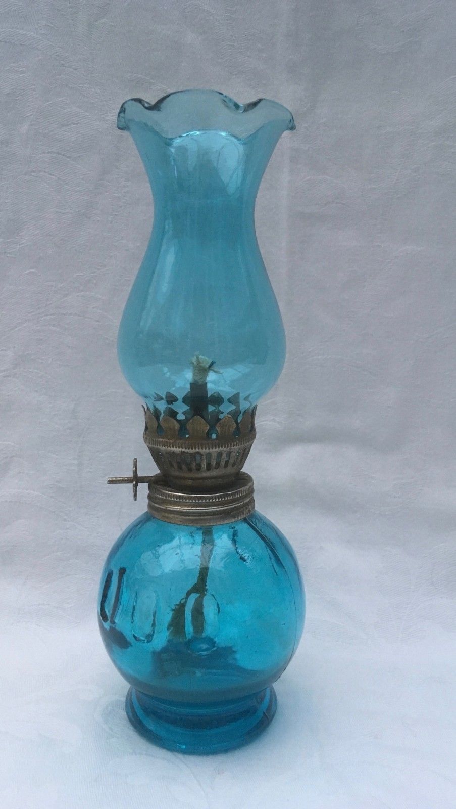 Title (ebay affiliate link): Vintage Lovely BLUE GLASS OIL LAMP Ruff Tulip Chimney H19,5 cm Made in Hong Kong