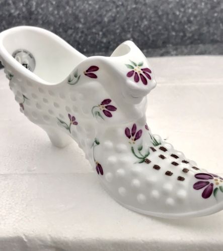 Title (ebay affiliate link): Fenton Popular HP Milk Glass Cat Slipper Purple Violets Mint! Signed! Free Ship!