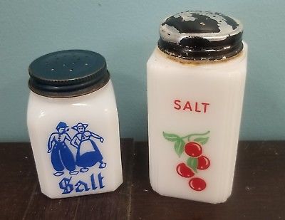 Title (ebay affiliate link): 2 USA DUTCH CHERRY MILK GLASS SALT SHAKERS RANGE SET S&P STOVE TOP BLUE RED