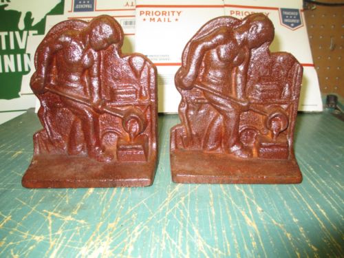 Antique Cast Iron Blacksmith Foundry Iron Worker Pouring Mold Bookend Pair