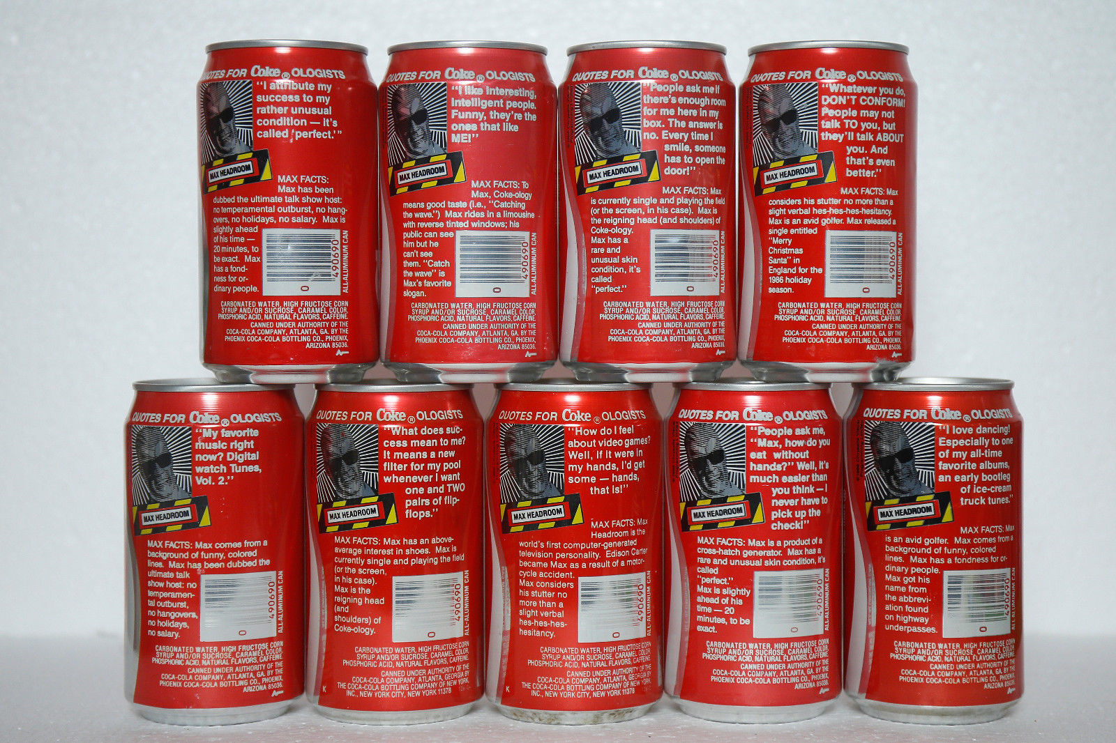 Title (ebay affiliate link): 1987 ''New Coke'' / Coca Cola 9 cans set from the USA, Max Headroom