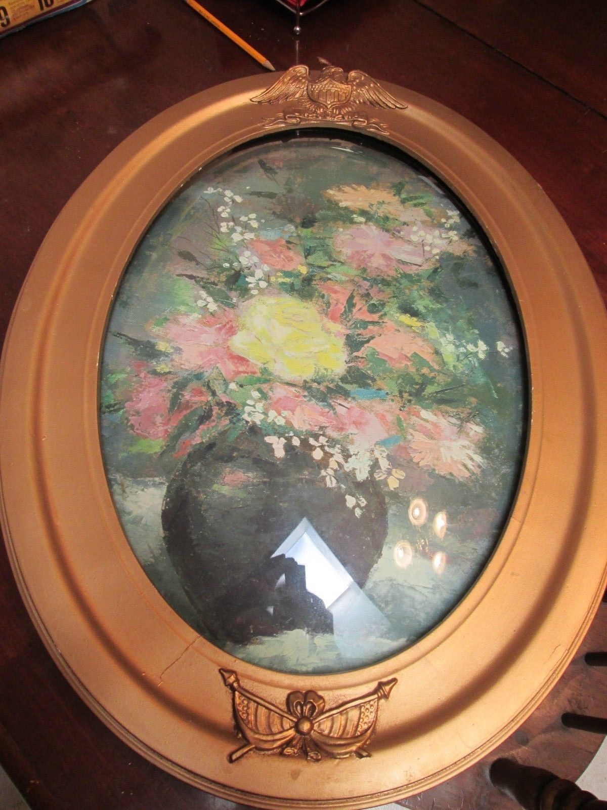 Antique Oval Bubble Glass Picture frame with Eagle USA Crest