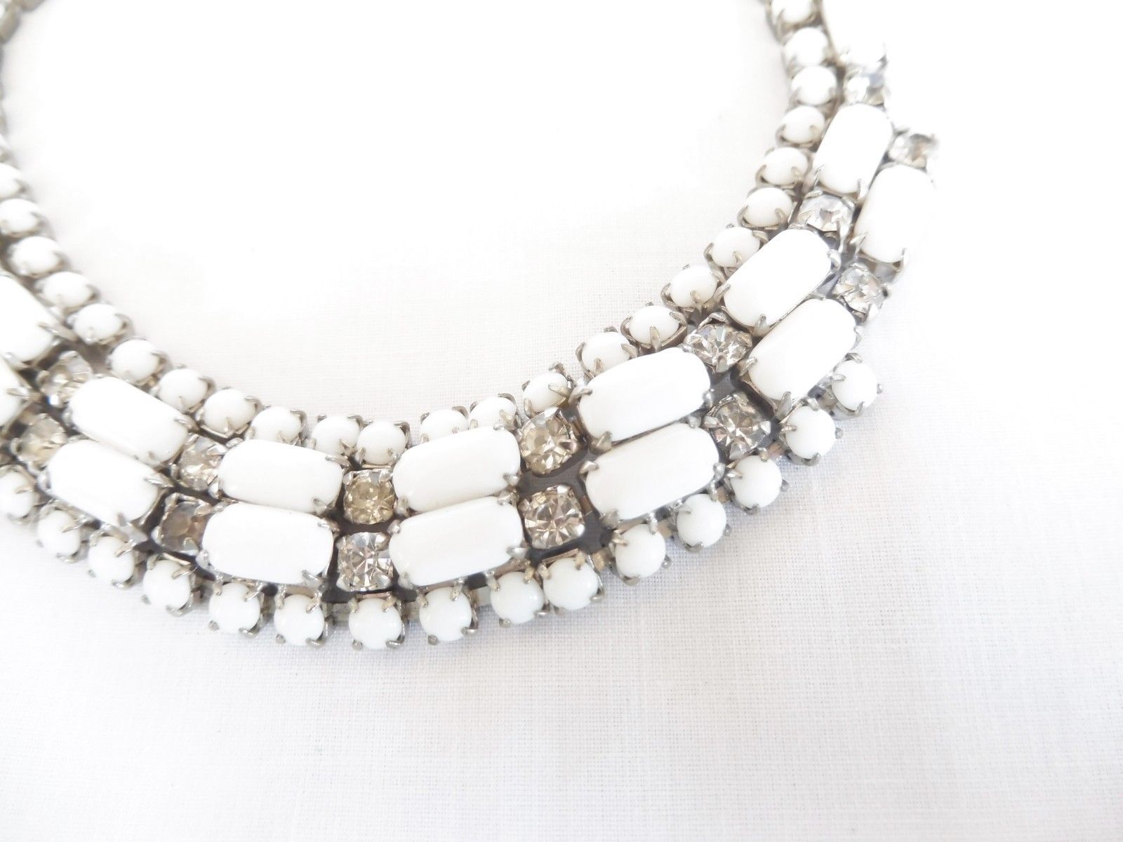 Vintage Milk Glass & Grey Rhinestone 3-Row Necklace