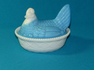 Antique Blue White Milk Glass Hen on Nest Westmoreland