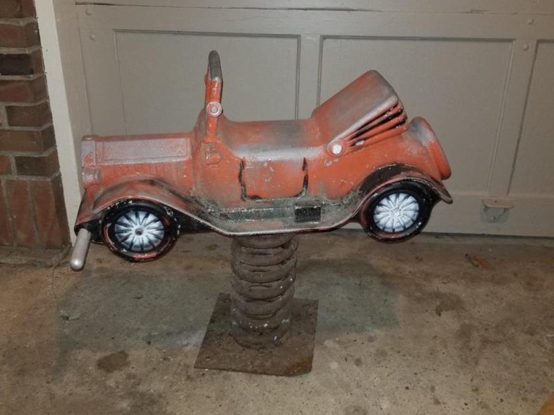 Title (ebay affiliate link): VINTAGE PLAYGROUND ALUMINUM SPRING RIDING TOY TOURING CAR BURKE CO. PATENT PEND