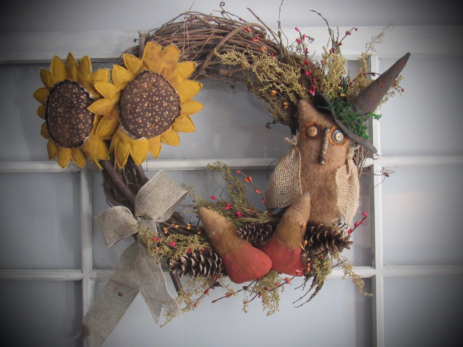 Primitive Fall, Halloween Wreath. Sunflowers, Candy corn and an Old Owl