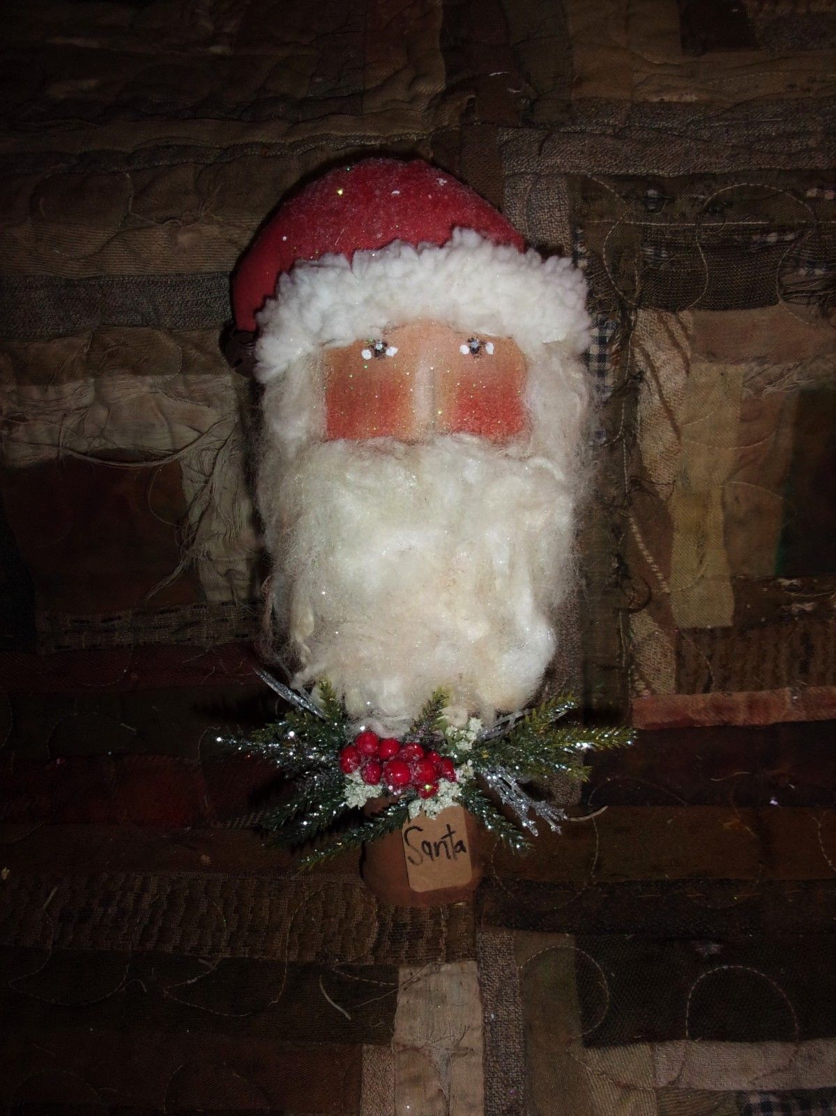 *Primitive 9x5in SPARKLED SANTA HEAD BOBBIN Fabric Country old rusty doll*