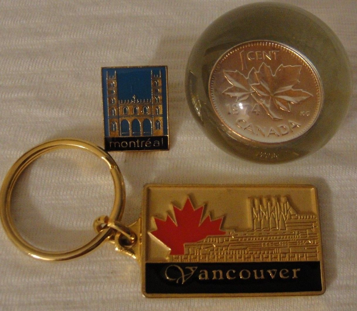 Title (ebay affiliate link): VINTAGE CANADA LOT OF 3 KEYCHAIN, LUCITE PAPERWEIGHT W/ COIN AND TACK PIN