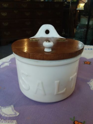 Title (ebay affiliate link): Antique Milk Glass Hoosier Hanging Primitive Salt Box with Oak Lid