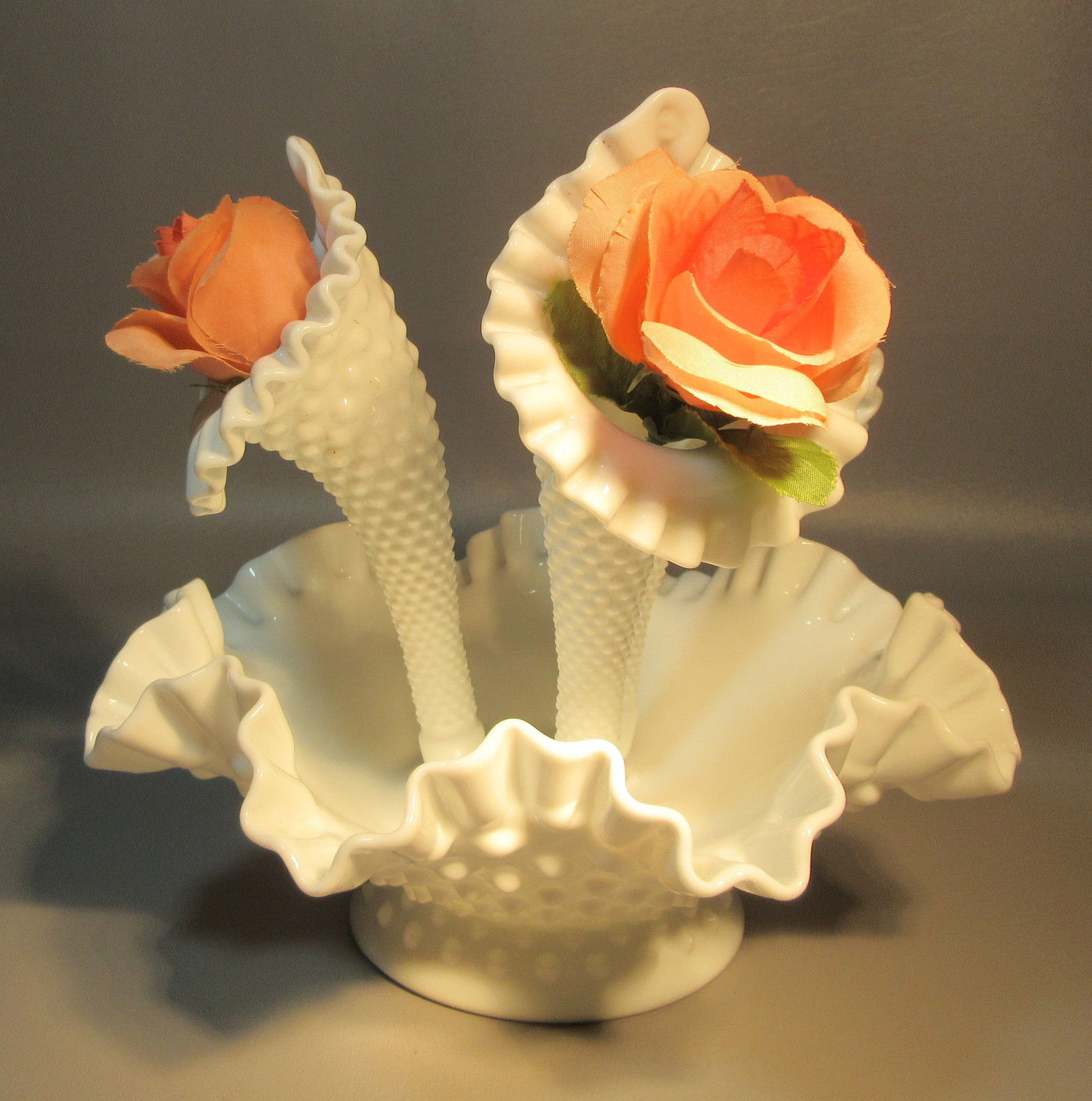 Title (ebay affiliate link): c1950 Fenton Hobnail Milk Glass Epergne Vase Ruffled Border On Bowl & 3 Horns