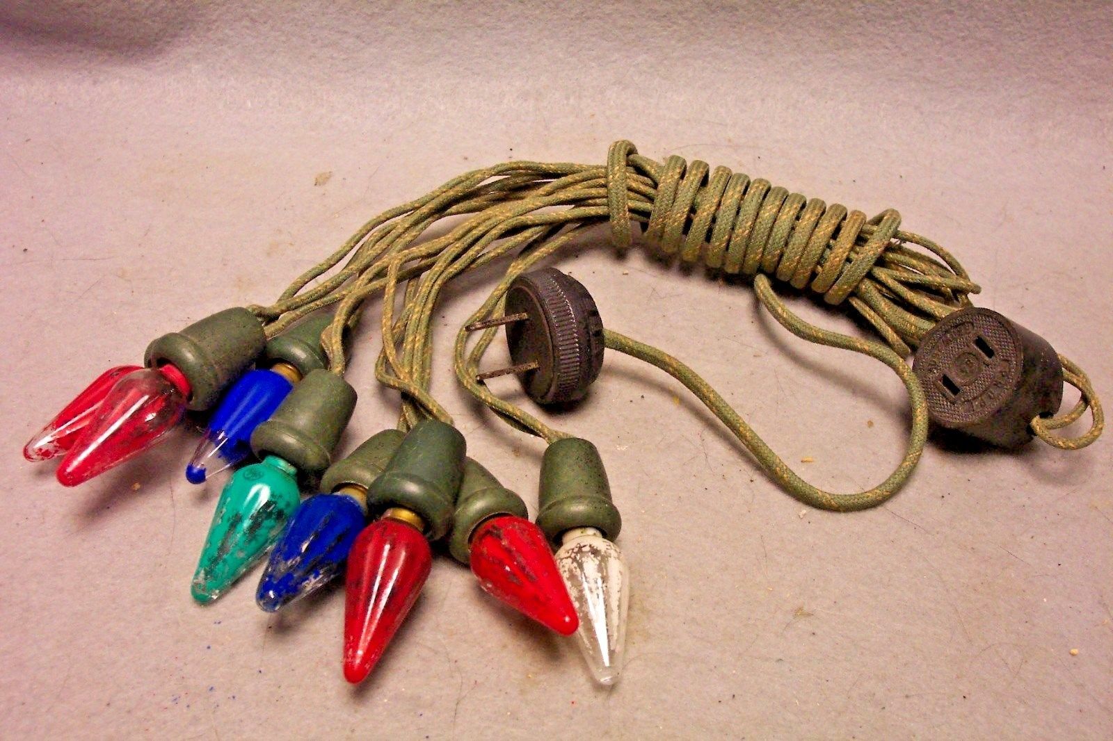 Title (ebay affiliate link): Early C6 Christmas light string with 8 bulbs FABRIC covered wires - Vintage