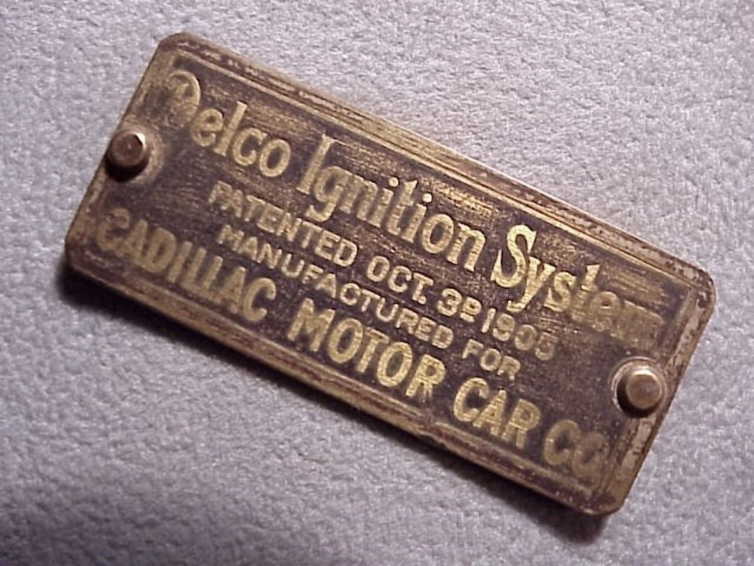 Title (ebay affiliate link): 1905~>CADILLAC MOTOR CO~DELCO IGNITION STYSTEM~NAME PLATE~Patent Oct 3, 1905