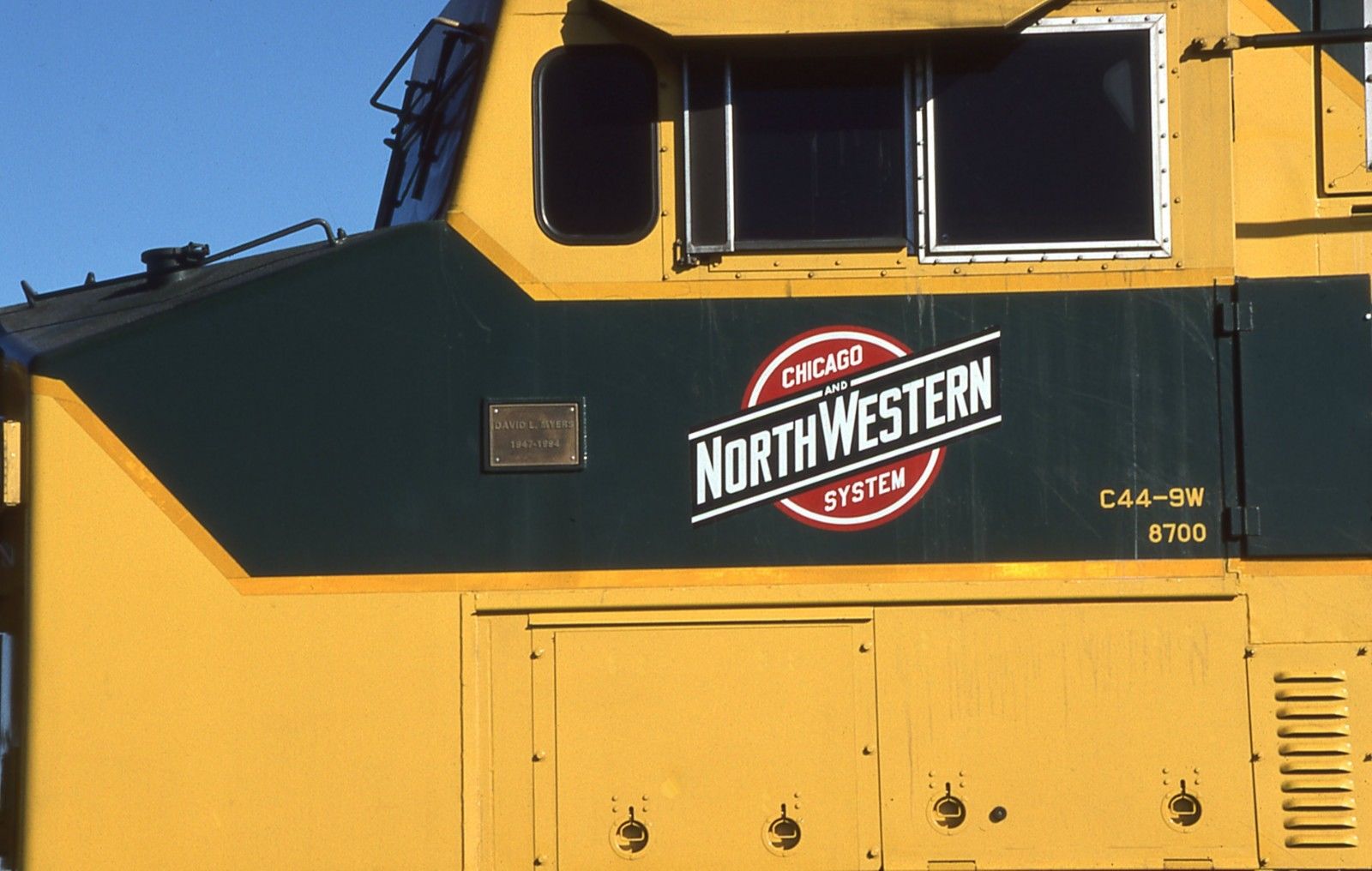 JS: Orig Slide CNW North Western C44-9W #8700 - Cab Detail shot w/Plaque in 1996