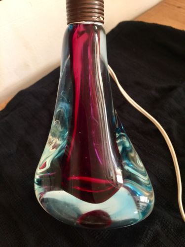 Title (ebay affiliate link): VAL ST LAMBERT ART GLASS TABLE LAMP, MID-CENTURY - DEEP RED AND AQUA GLASS TWIST