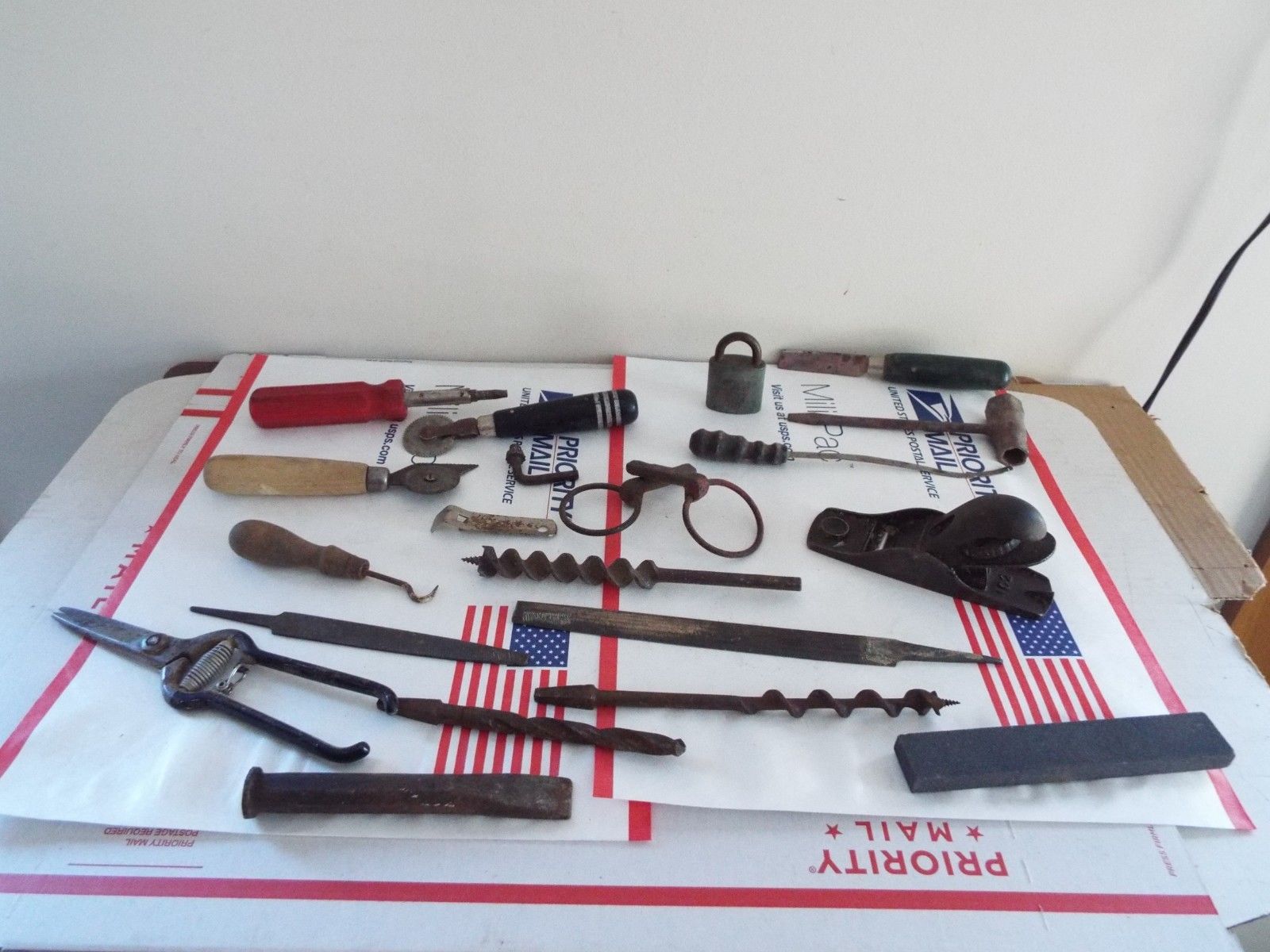 Title (ebay affiliate link): VINTAGE TOOL LOT, AUGER BITS, WOOD PLANER, SHARPENING STONE, MISC TOOLS