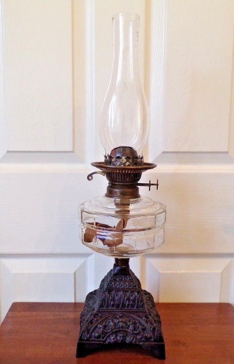 Title (ebay affiliate link): Victorian oil lamp cut clear glass font cast iron base working order