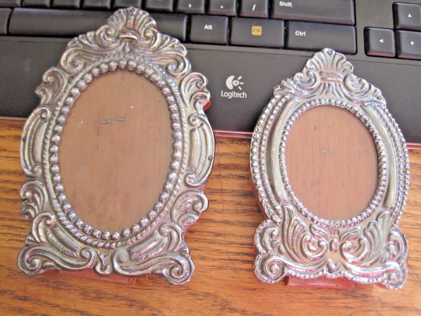 Title (ebay affiliate link): 2 ANTIQUE ORNATE EMBOSSED STERLING & WALNUT EASEL BACK PICTURE FRAMES