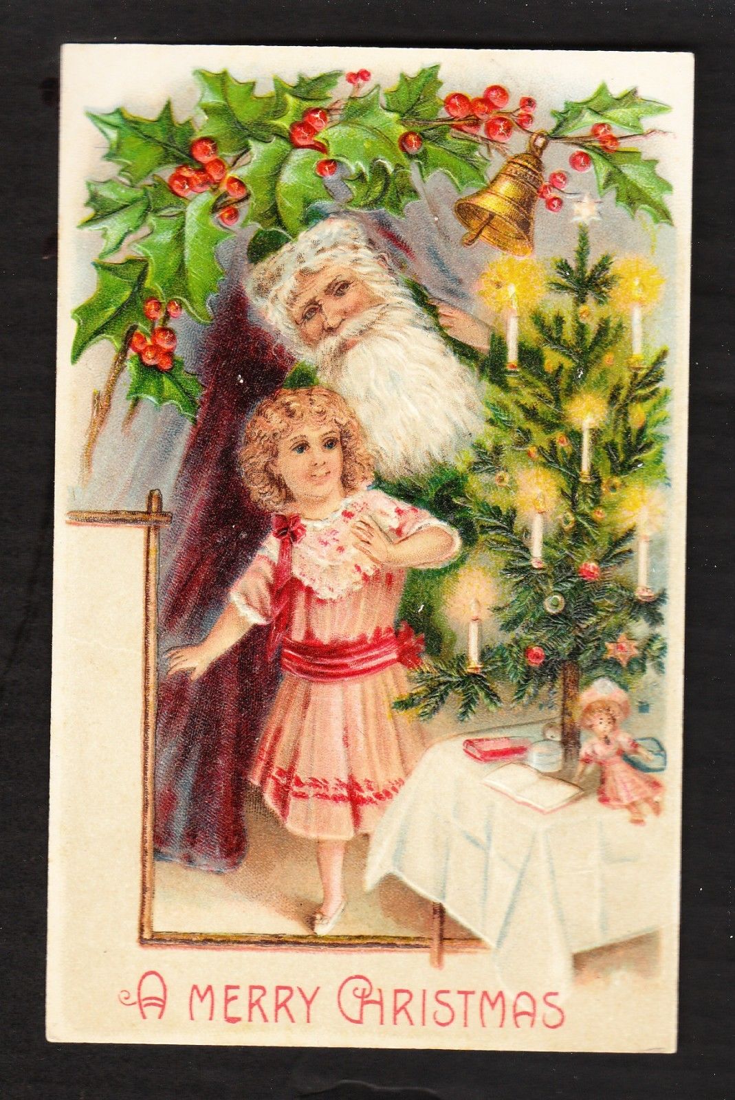 Title (ebay affiliate link): Santa Claus with candle lit tree . circa 1915 embossed Christmas postcard