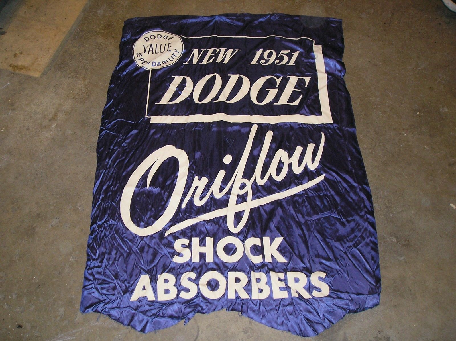 Authentic Vintage Silky Banner Reads: "New 1951 Dodge Oriflow Shock Absorbers"