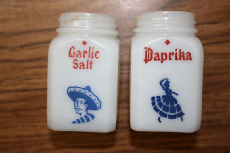 Title (ebay affiliate link): 2 - Vintage Milk Glass Spice Shakers W/ Mexican Graphic - Garlic Salt & Paprika