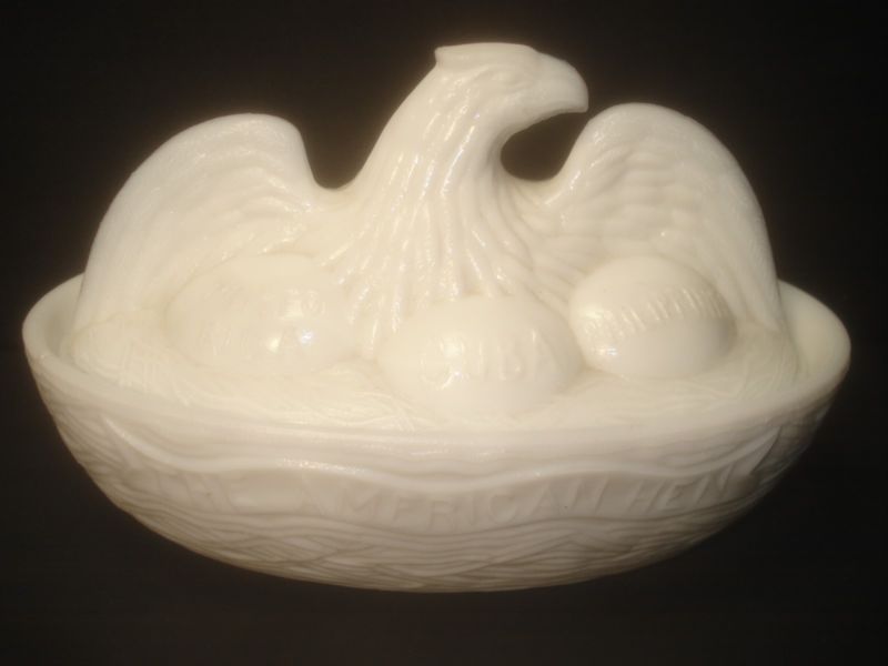 Title (ebay affiliate link): circa 1898 "The American Hen" Eagle Hen-on-Nest Milk Glass Covered Dish