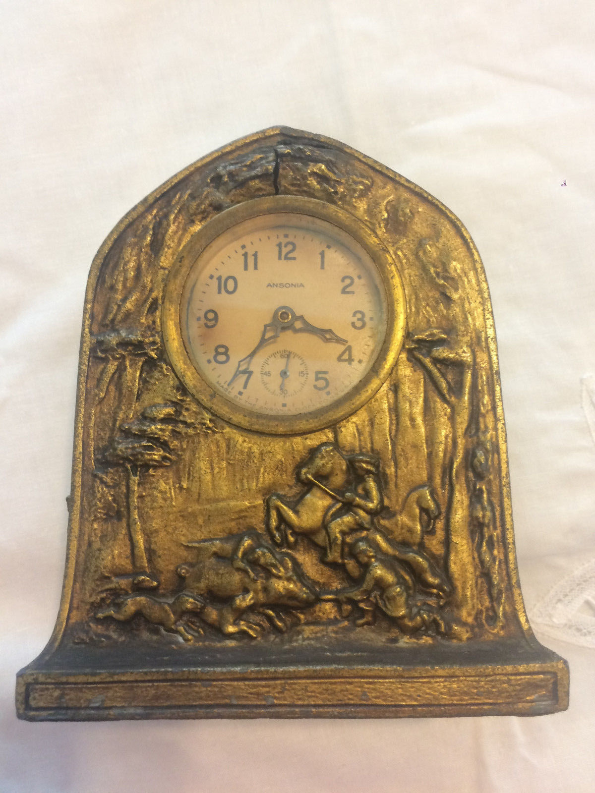 Title (ebay affiliate link): Rare Antique BRONZE METAL ANSONIA MANTLE ALARM CLOCK HUNTING SCENE
