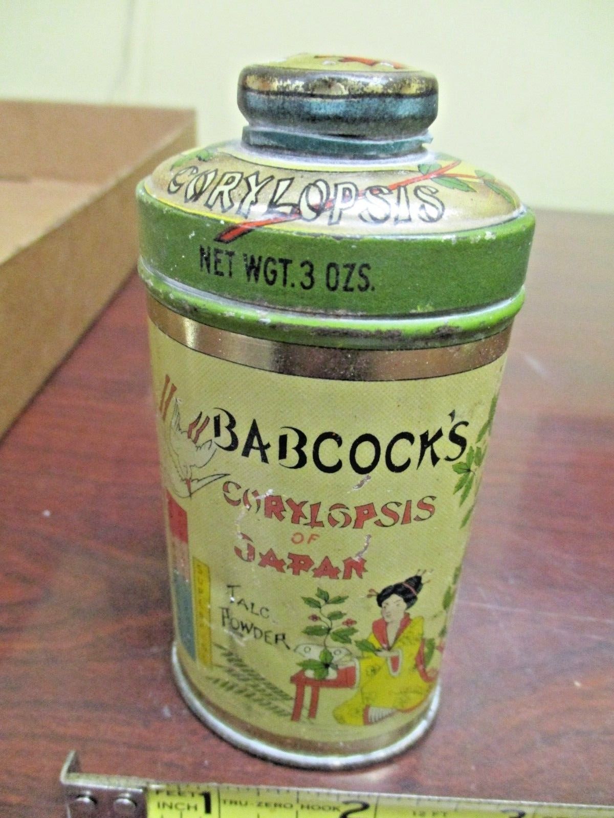 Title (ebay affiliate link): Vintage 1910s Advertising Talcum Powder Tin Babcock''s Corylopsis of japan Geisha