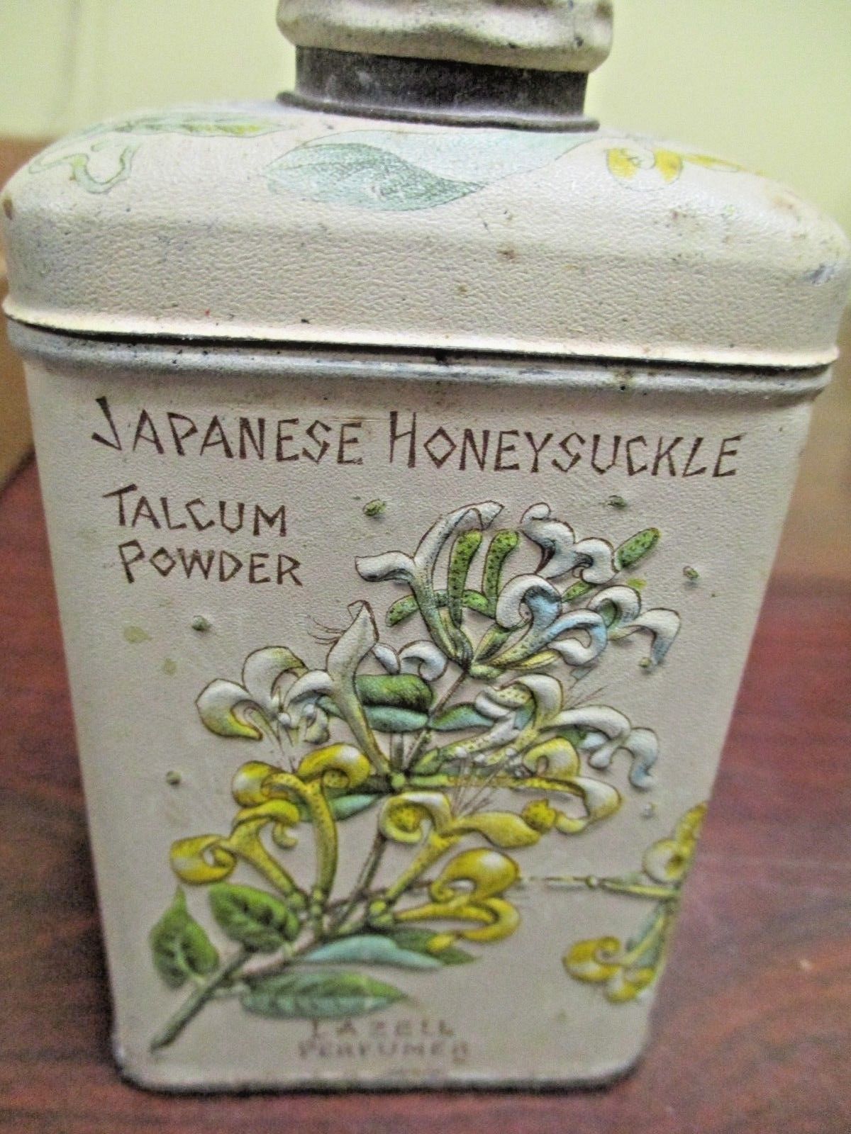 Title (ebay affiliate link): Vintage 1910s Advertising Talcum Powder Tin Japanese Honeysuckle Lazell Embossed