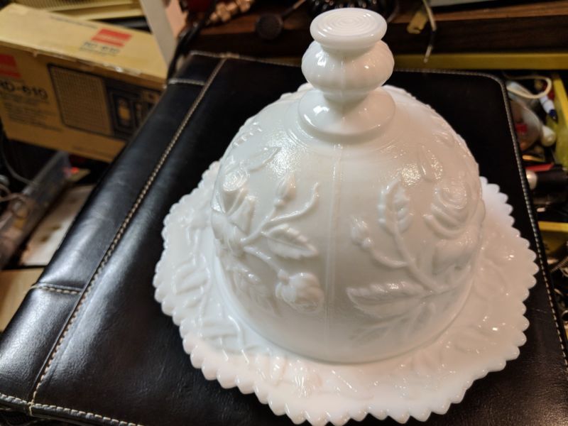 Title (ebay affiliate link): **WOW** WHITE MILK GLASS COVERED BUTTER/CHEESE DISH WITH FLOWERS IMPERIAL Glass