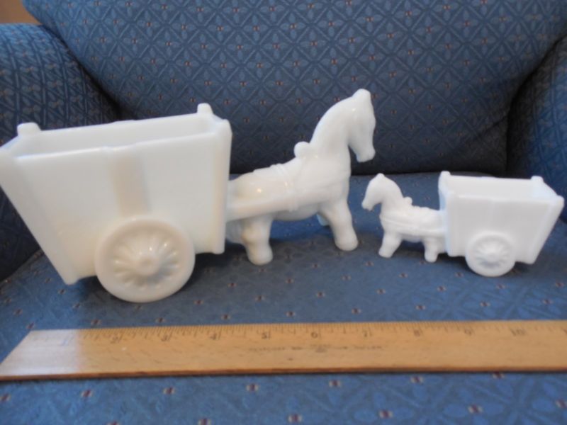 Two White Milk Glass Horse and Cart Figurines