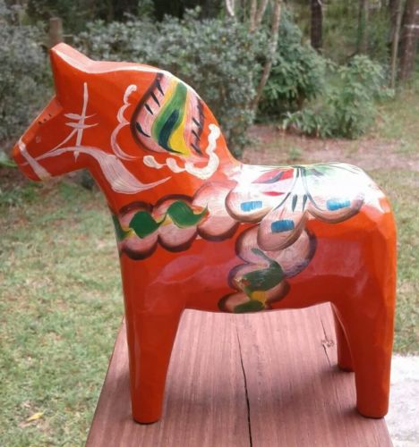Title (ebay affiliate link): Vintage Dala Swedish Horse Akta w/ original label Orange 6-1/2" Folk Art Sweden
