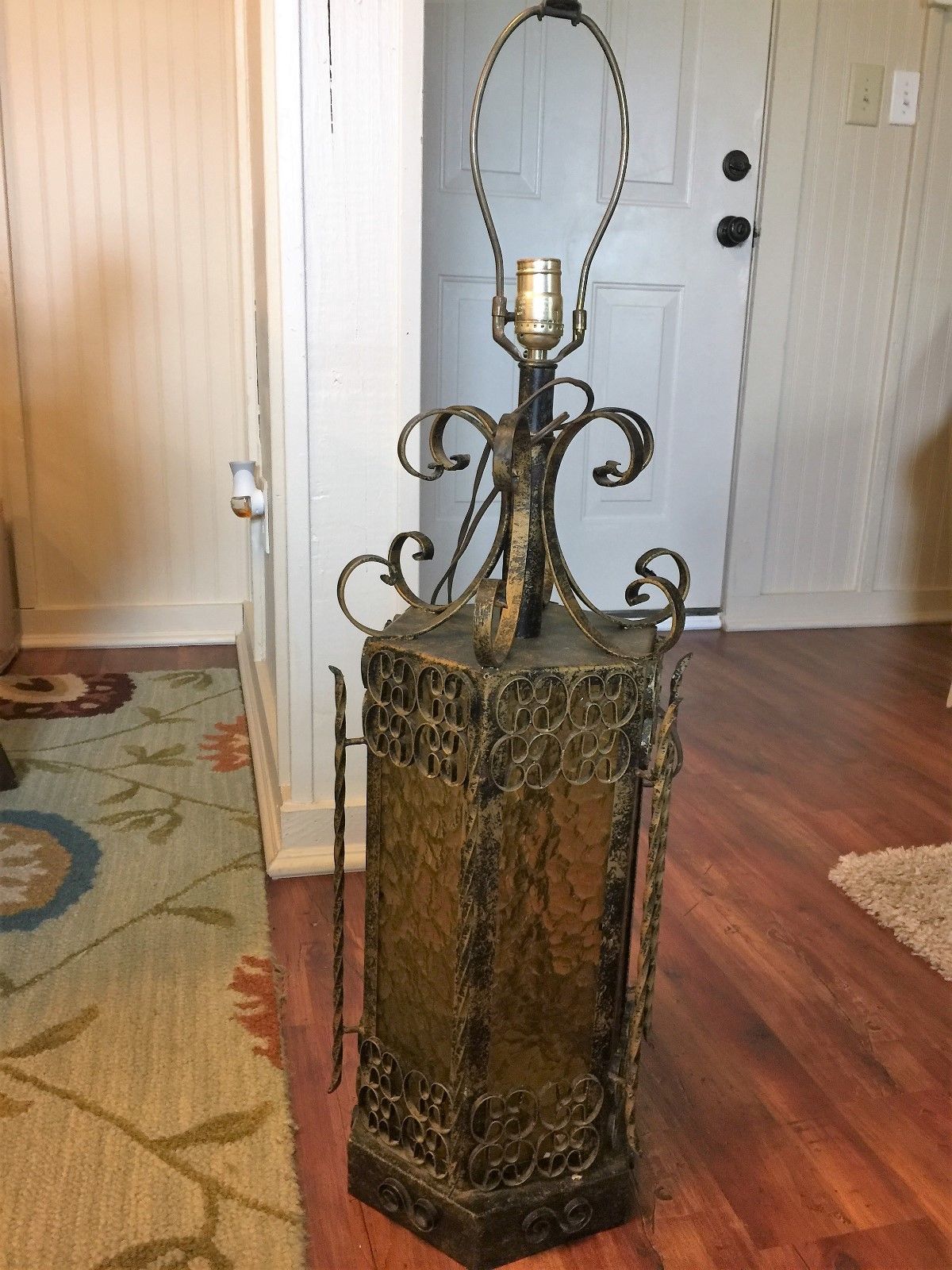 Title (ebay affiliate link): VINTAGE SPANISH GOTHIC STYLE TABLE LAMP WROUGHT IRON AMBER STAINED GLASS