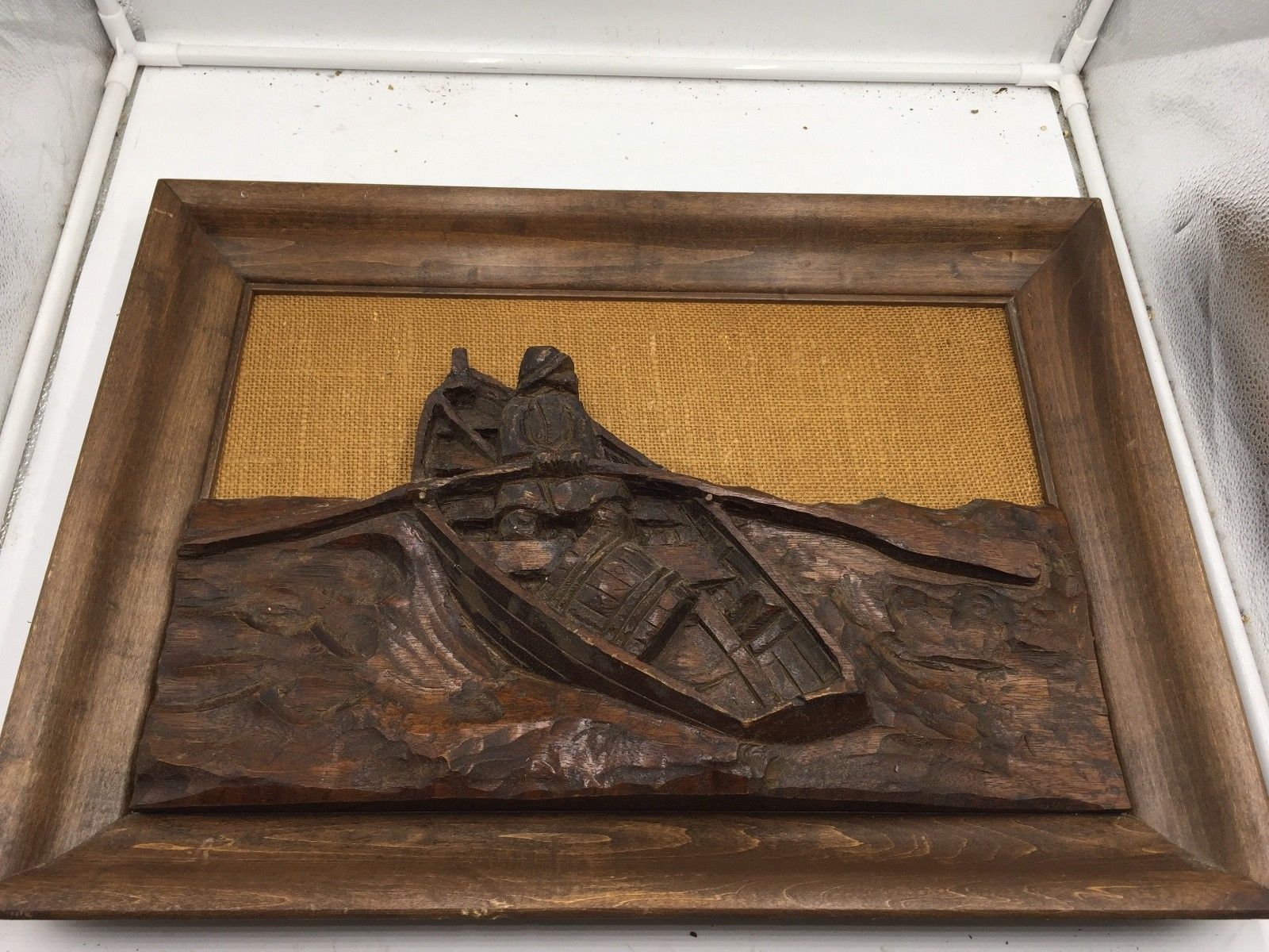 Title (ebay affiliate link): Estate Vintage Wood Carved Man in Boat Fisherman Old Man & The Sea Wall Folk Art