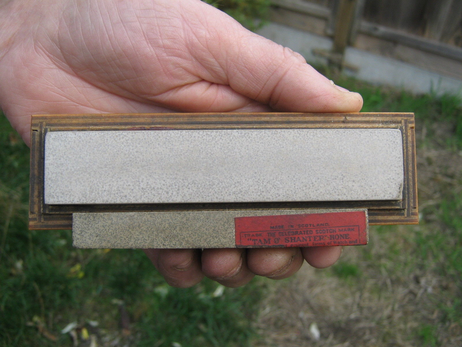 SMALL NATURAL TAM O'' SHANTER SCOTCH HONE IN BOX, + SMALL T.O.S STICK WITH LABEL