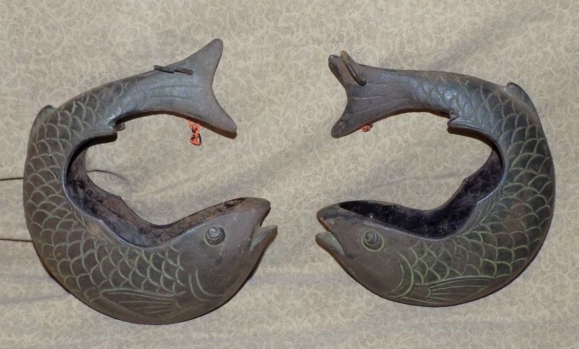Pair Vintage Antique Ornate Metal Hanging Planter Koi ? Fish Decorative