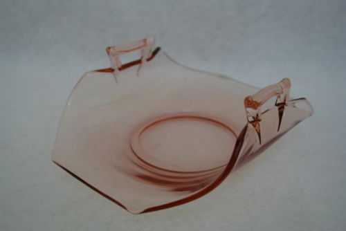 Title (ebay affiliate link): Vtg Pink Depression Glass Dish With Turned-Up Sides & Handles