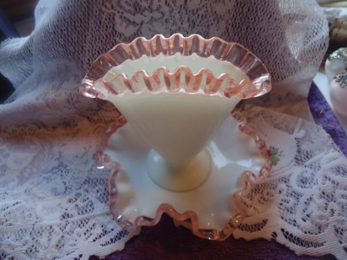 Title (ebay affiliate link): Fenton Vintage Pink Ruffle Edge Small Milk Glass Vase & bon Dish Plate pre-logo