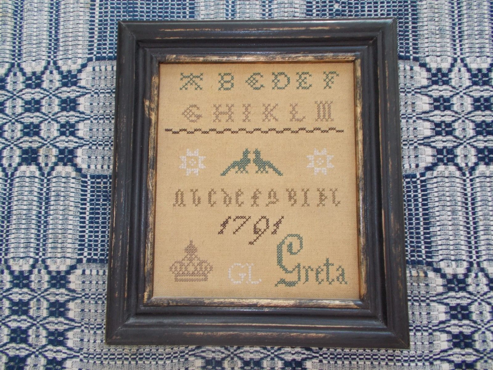 Title (ebay affiliate link): Primitive Framed Sampler on Linen / Green, Browns & White